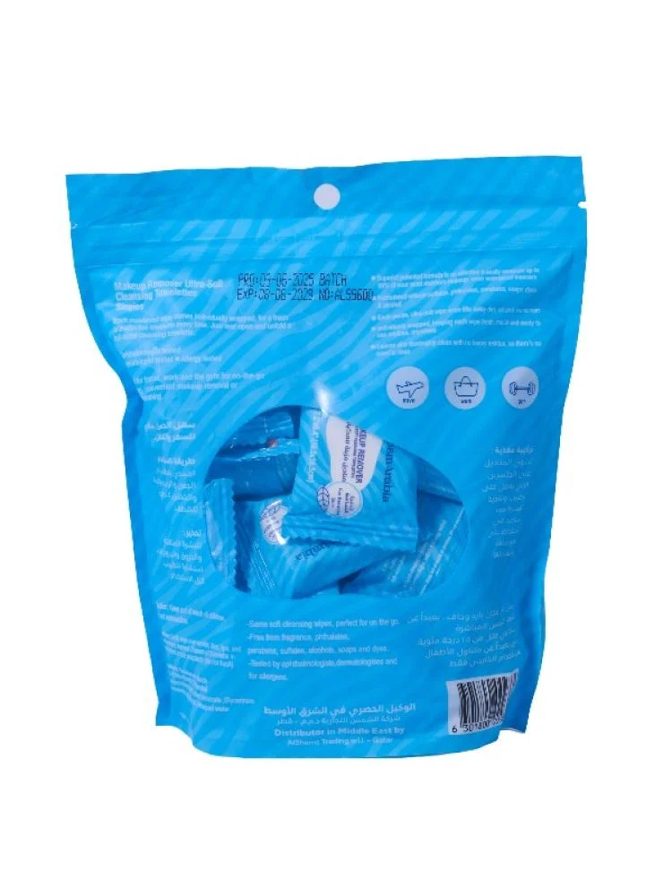 1 ارفعي الغطاء اللاصق واسحبي منديلاً واحداً. 2 مرري المنديل بلطف على كامل الوجه والرقبة، وبالنسبة للعينين، ضعي المنديل لثوانٍ ثم امسحي برفق. 3 أغلقي العبوة فوراً وبإحكام للحفاظ على رطوبة المناديل المتبقية. 4 مثالية للاستخدام في نهاية اليوم أو كخطوة سريعة لتجديد انتعاش وجهك.