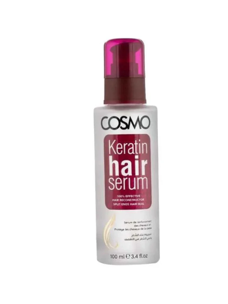 قوة الكيراتين لشعر انسيابي كالحرير.. Cosmo Hair Serum المعزز بالكيراتين هو السر الاحترافي للحصول على شعر مفرود وناعم في وقت قياسي. صُمم هذا السيروم خصيصاً لترميم ألياف الشعر وإعادة بناء البروتين المفقود، مما يحول الشعر المتعب والمجعد إلى خصلات قوية تفيض باللمعان والجمال.